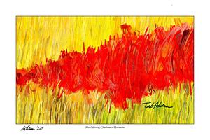 DESCRIPTION: Digital painting of native Rhus typhinia (Staghorn Sumac) (Dakota: "cha zi", | Lakota: "čhaŋz", | Ojibwe: "baakwaanaatig") in a drift of vibrant autumn red color, slicing boldly as a color-filled wedge into a restored pasture of golden prairie grasses. Early morning. Early fall. ~///~ TYPE: Digital hand-painted image -- no AI ~///~ AVAILABLE PRINT FORMATS: horizontal/landscape, vertical/portrait, square (see my "collections"). ~///~ MATERIALS: framed or unframed | archival professional paper | archival fine art paper | museum-quality wrapped canvas (black or white wrap edge) | metal (weatherproofed aluminum, float 1/2" off wall). | Print material options in the drop-downs above. ~///~ SIZES: print sizes and pricing are cataloged in the drop-downs above.