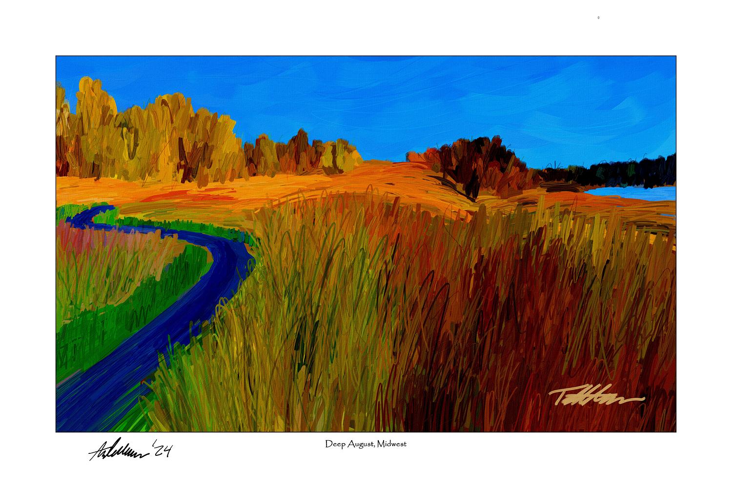 TITLE: ‘Deep August, Midwest’ (USA). ~///~ DESCRIPTION: (Prints) Digital painting of a midwestern prairie patch in late August. Early evening. ~///~ Digitally hand-painted image (no AI is used) ~///~ AVAILABLE PRINT FORMATS: horizontal/landscape, vertical/portrait, square (see my “collections”). ~///~ AVAILABLE MATERIALS: framed or unframed | archival professional paper | archival fine art paper | museum-quality wrapped canvas (black or white wrap edge) | metal (weatherproofed aluminum, float 1/2" off wall). | Print material options in the drop-downs above. ~///~ AVAILABLE SIZES: print sizes and pricing are cataloged in the drop-downs above.