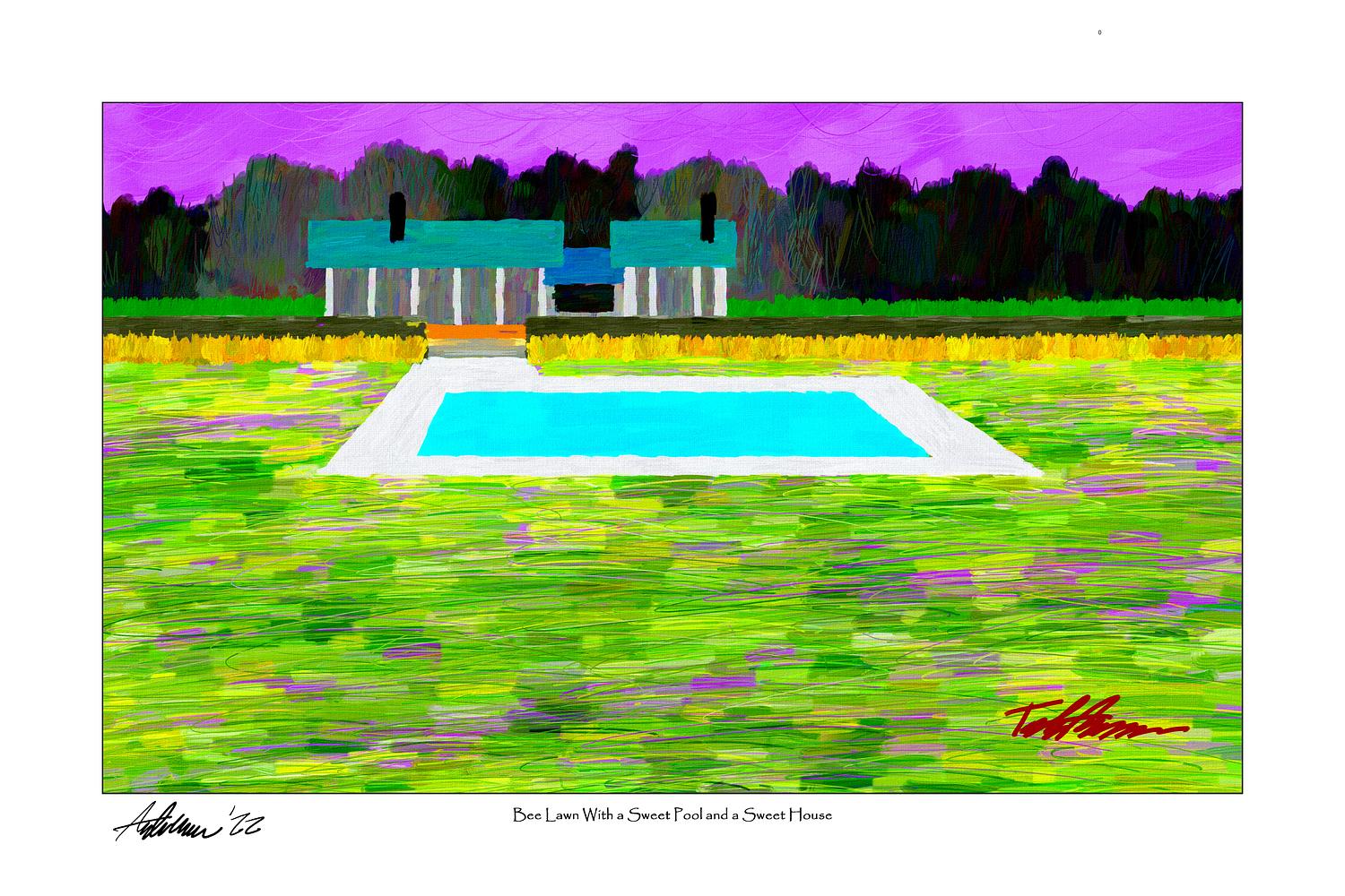 TITLE: ‘Bee Lawn With a Sweet Pool and a Sweet House’ ~///~ DESCRIPTION: (Prints) Digital painting of a carpet of low-growing pollinator plants, creating a bee lawn. A turquoise pool sits in the bee lawn, in front of a modern house. ~///~ TYPE: Digitally hand-painted image (no AI is used) ~///~ AVAILABLE PRINT FORMATS: horizontal/landscape, vertical/portrait, square (see my “collections”). ~///~ AVAILABLE MATERIALS: framed or unframed | archival professional paper | archival fine art paper | museum-quality wrapped canvas (black or white wrap edge) | metal (weatherproofed aluminum, float 1/2" off wall). | Print material options in the drop-downs above. ~///~ AVAILABLE SIZES: print sizes and pricing are cataloged in the drop-downs above.