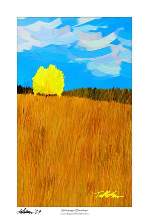 TITLE: ‘Andropogon Downslope', Carver Regional Park, Minnesota (USA) ~///~ DESCRIPTION: (Prints) Digital painting of a tawny hillside of Andropogon gerardii (Big Bluestem) (Ojibwe: "mashkodekonayewashk", | Anishinaabe: "ozhaawashkowashkwinek", | Lakota: "pȟeží šašá ókhih", | Omaha-Ponca: "hade-zhide"), with a lemon-yellow Quaking Aspen cluster near the top (Populus tremuloides) (Ojibwe/Anishinaabe: "azaadi", "azaadiiyatig"), and set against a blue prairie sky. ~///~ TYPE: Digitally hand-painted image (no AI is used) ~///~ AVAILABLE PRINT FORMATS: horizontal/landscape, vertical/portrait, square (see my “collections”). ~///~ AVAILABLE MATERIALS: framed or unframed | archival professional paper | archival fine art paper | museum-quality wrapped canvas (black or white wrap edge) | metal (weatherproofed aluminum, float 1/2" off wall). | Print material options in the drop-downs above. ~///~ AVAILABLE SIZES: print sizes and pricing are cataloged in the drop-downs above.
