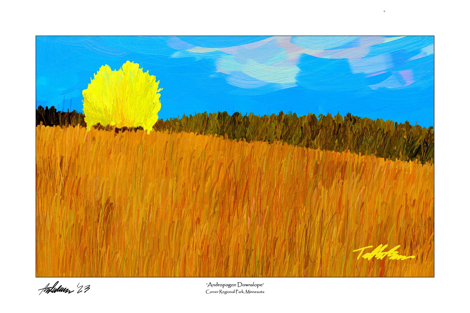 TITLE: ‘Andropogon Downslope', Carver Regional Park, Minnesota (USA) ~///~ DESCRIPTION: (Prints) Digital painting of a tawny hillside of Andropogon gerardii (Big Bluestem) (Ojibwe: "mashkodekonayewashk", | Anishinaabe: "ozhaawashkowashkwinek", | Lakota: "pȟeží šašá ókhih", | Omaha-Ponca: "hade-zhide"), with a lemon-yellow Quaking Aspen cluster near the top (Populus tremuloides) (Ojibwe/Anishinaabe: "azaadi", "azaadiiyatig"), and set against a blue prairie sky. ~///~ TYPE: Digitally hand-painted image (no AI is used) ~///~ AVAILABLE PRINT FORMATS: horizontal/landscape, vertical/portrait, square (see my “collections”). ~///~ AVAILABLE MATERIALS: framed or unframed | archival professional paper | archival fine art paper | museum-quality wrapped canvas (black or white wrap edge) | metal (weatherproofed aluminum, float 1/2" off wall). | Print material options in the drop-downs above. ~///~ AVAILABLE SIZES: print sizes and pricing are cataloged in the drop-downs above.