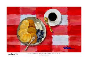 TITLE: ‘Pancakes and Blueberries with Coffee, on Red and White Checked Tablecloth’ ~///~ DESCRIPTION: (Prints) Digital painting of a table setting of breakfast fare | A plate of pancakes with blueberries and vanilla yogurt. Coffee to drink | The place setting is waiting on a red and white checked oilcloth tablecloth. ~///~ TYPE: Digitally hand-painted image (no AI is used) ~///~ AVAILABLE PRINT FORMATS: horizontal/landscape, vertical/portrait, square (see my “collections”). ~///~ AVAILABLE MATERIALS: framed or unframed | archival professional paper | archival fine art paper | museum-quality wrapped canvas (black or white wrap edge) | metal (weatherproofed aluminum, float 1/2" off wall). | Print material options in the drop-downs above. ~///~ AVAILABLE SIZES: print sizes and pricing are cataloged in the drop-downs above.