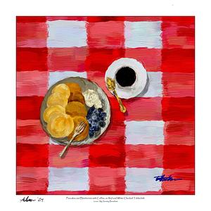 TITLE: ‘Pancakes and Blueberries with Coffee, on Red and White Checked Tablecloth’ ~///~ DESCRIPTION: (Prints) Digital painting of a table setting of breakfast fare | A plate of pancakes with blueberries and vanilla yogurt. Coffee to drink | The place setting is waiting on a red and white checked oilcloth tablecloth. ~///~ TYPE: Digitally hand-painted image (no AI is used) ~///~ AVAILABLE PRINT FORMATS: horizontal/landscape, vertical/portrait, square (see my “collections”). ~///~ AVAILABLE MATERIALS: framed or unframed | archival professional paper | archival fine art paper | museum-quality wrapped canvas (black or white wrap edge) | metal (weatherproofed aluminum, float 1/2" off wall). | Print material options in the drop-downs above. ~///~ AVAILABLE SIZES: print sizes and pricing are cataloged in the drop-downs above.
