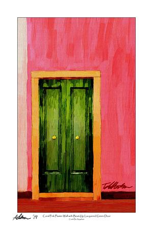 'Coral Pink Plaster Wall with Beat-Up Lacquered Green Door' Could Be Anywhere (vertical format)
