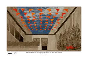 'Fifty-Six Orange Flags and Some Blue Sky, Over a Tiny Coffee Shop Courtyard' Northern Minnesota (selective color) (horizontal format)