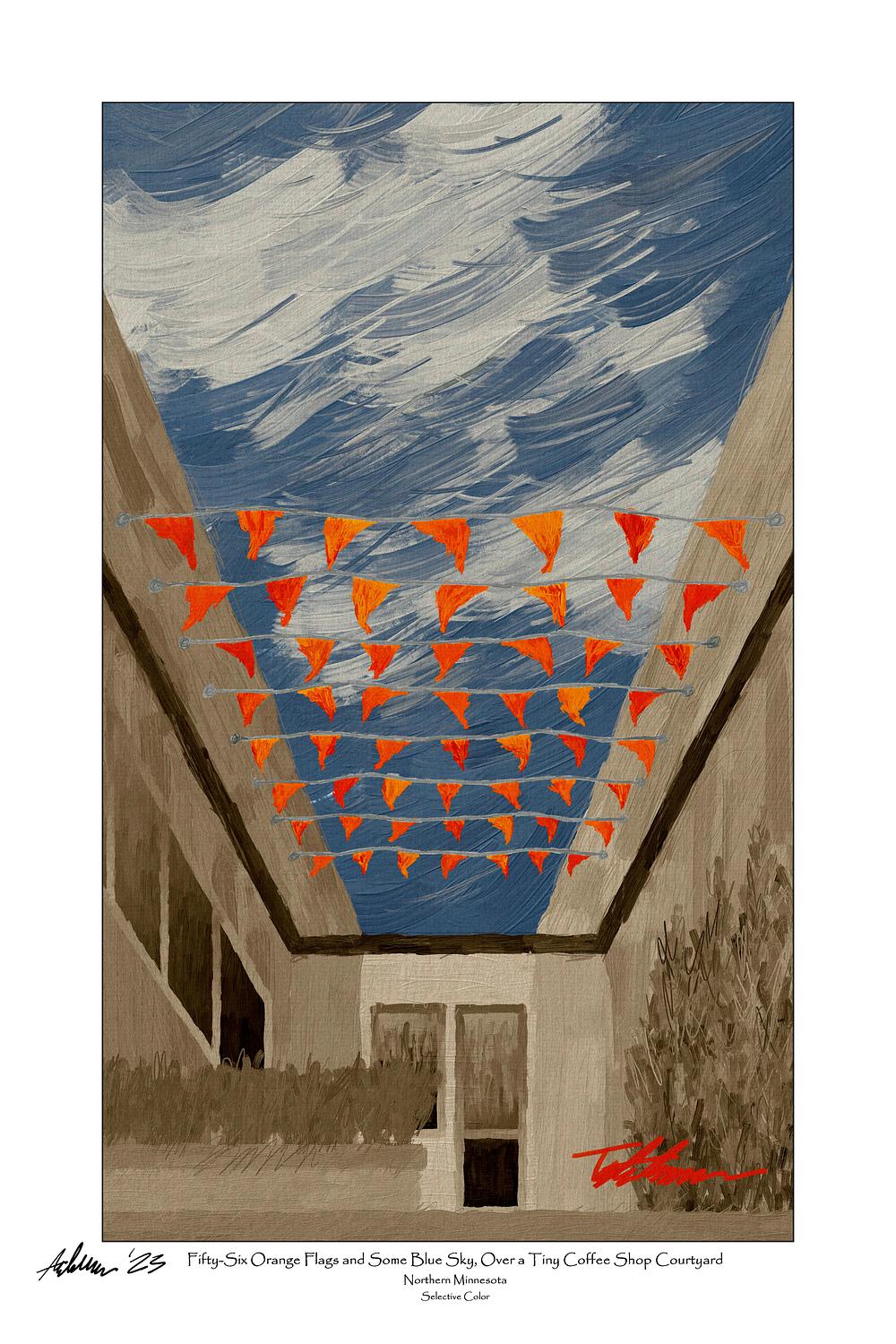 'Fifty-Six Orange Flags and Some Blue Sky, Over a Tiny Coffee Shop Courtyard' Northern Minnesota (selective color) (vertical format)