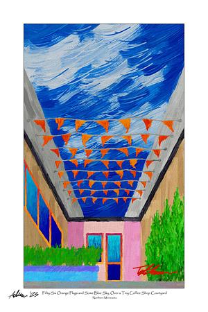 'Fifty-Six Orange Flags and Some Blue Sky, Over a Tiny Coffee Shop Courtyard' Northern Minnesota (vertical format)